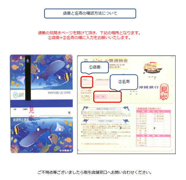 店番、名寄番号につきましてはお手元のお通帳にてご確認下さい。